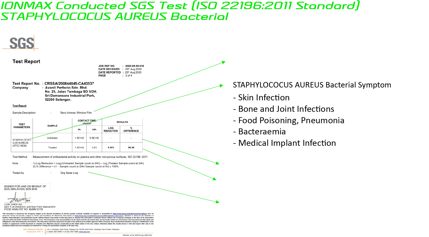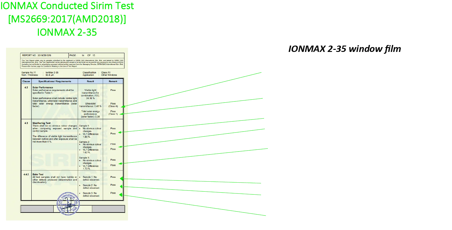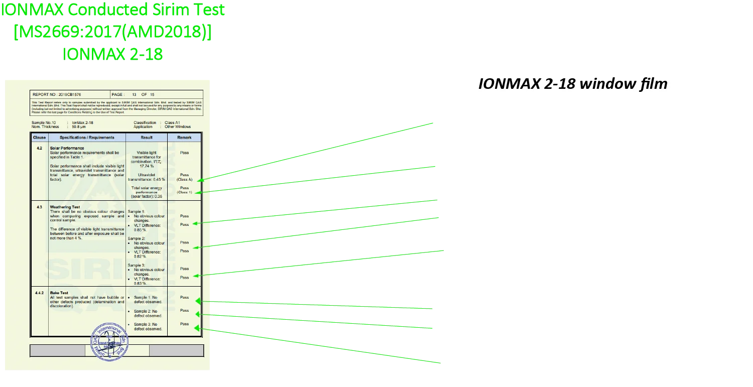 Surface antibacterial properties of 99.99% through international test bodies inspection based on 2 standards. International SGS report and Malaysia SIRIM quality test report with the result of class 1; class A.SGS(ISO 22196:2011), proving that within 24 hours eliminates 99.99% bacteria and fungus, (ATCC 6538, ATCC 8739) (MS2669:2018) Solar Performance Full Pass with result of class 1, class A, weathering test full pass and bake test full pass to ensure the quality of the window film.